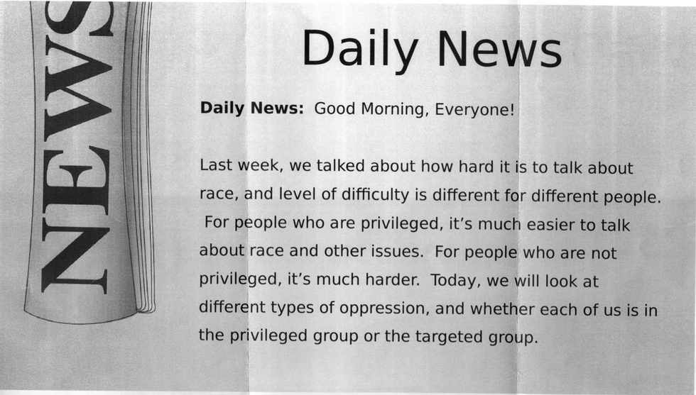 In an introductory note, Anderson told students, "Last week, we talked about how hard it is to talk about race, and the level of difficulty is different for different people. For people who are privileged, it's much easier to talk about race and other issues. For people who are not privileged, it's much harder. Today, we will look at different types of oppression, and whether each of us is in the privileged group or the targeted group."