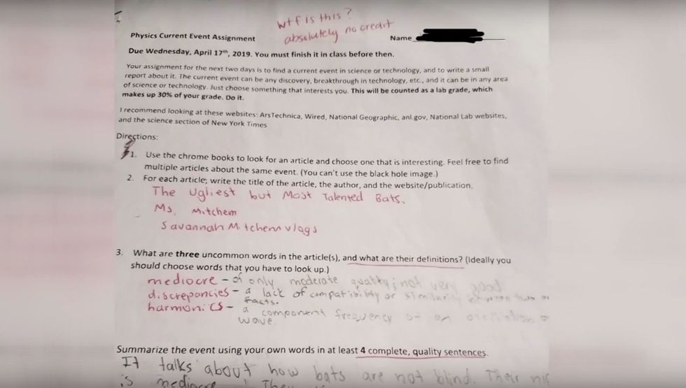 Melinda Smith, the mother of the Rutherford High School student, told WJHG-TV she was shocked to see "WTF" at the top of her son's science homework sheet.