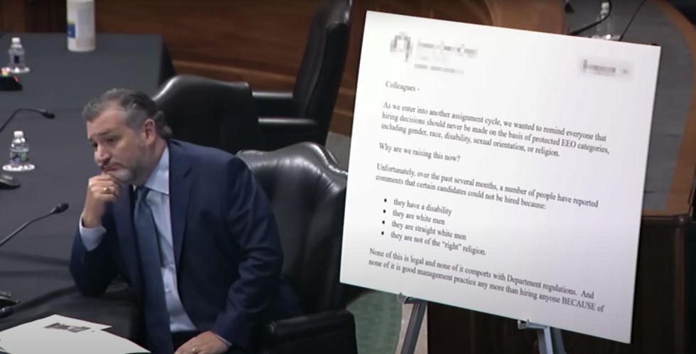 "The email says that hiring practices have developed inside the State Department so that 'certain candidates could not be hired because they have a disability; they are white men; they are straight, white men; they are not of the 'right religion,'" Cruz said.