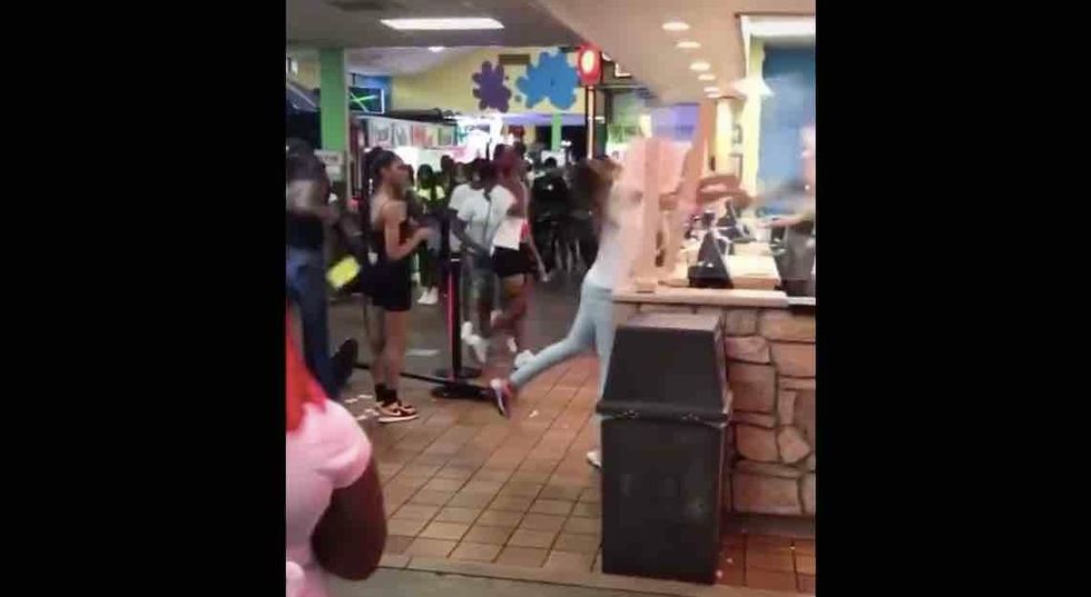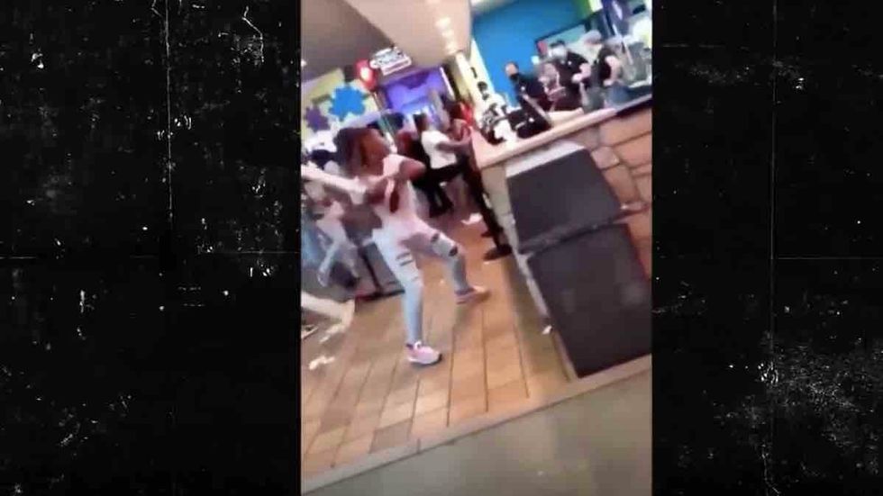 Video of the rioting shows a girl busting up transparent dividers and destroying a counter. She also grabs heavy stands and chucks them across the counter at terrified employees who scamper away: