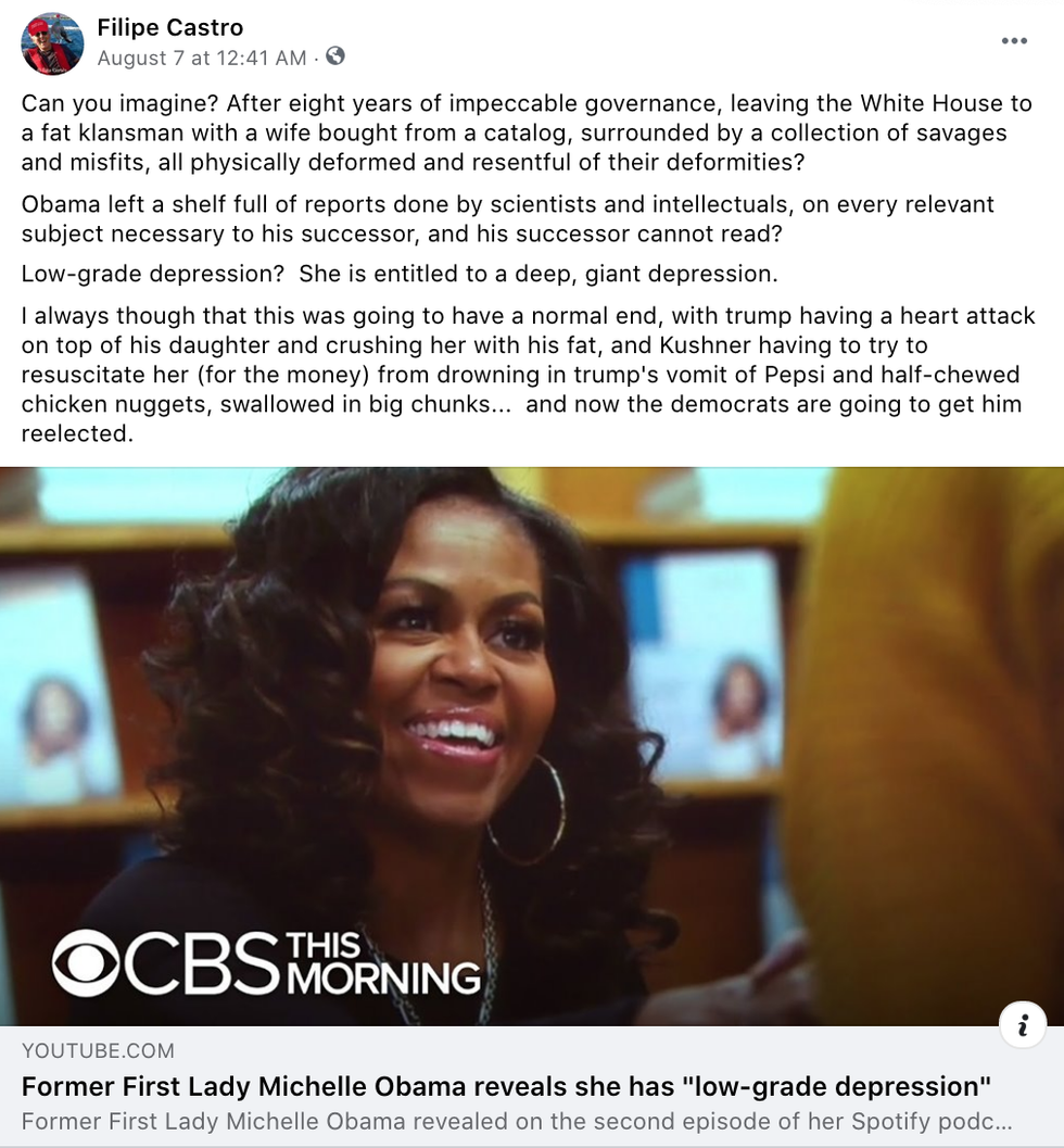 Earlier this month, Castro took to the social media platform to defend President Barack Obama's "eight years of impeccable governance" and refer to Trump as a "fat klansman" who is "surrounded by a collection of savages and misfits."