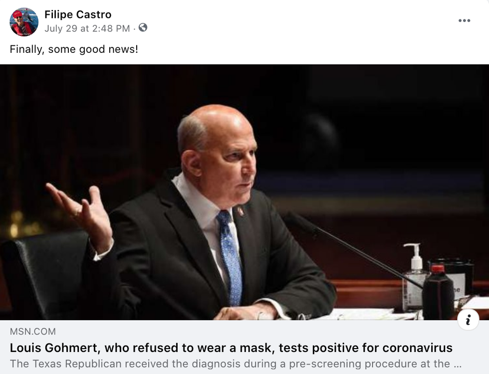 In July, after it was revealed that Gohmert had contracted the virus, Castro reposted an article and stated: "Finally, some good news!"