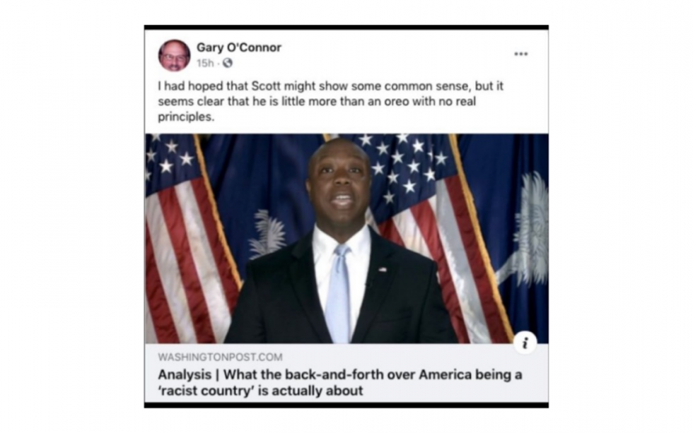 Reacting to Scott absolving America from being inherently racist, Lamar County Democratic Party chair Gary O'Connor called Scott an "oreo" in a now-deleted Facebook post, Fox News reported.