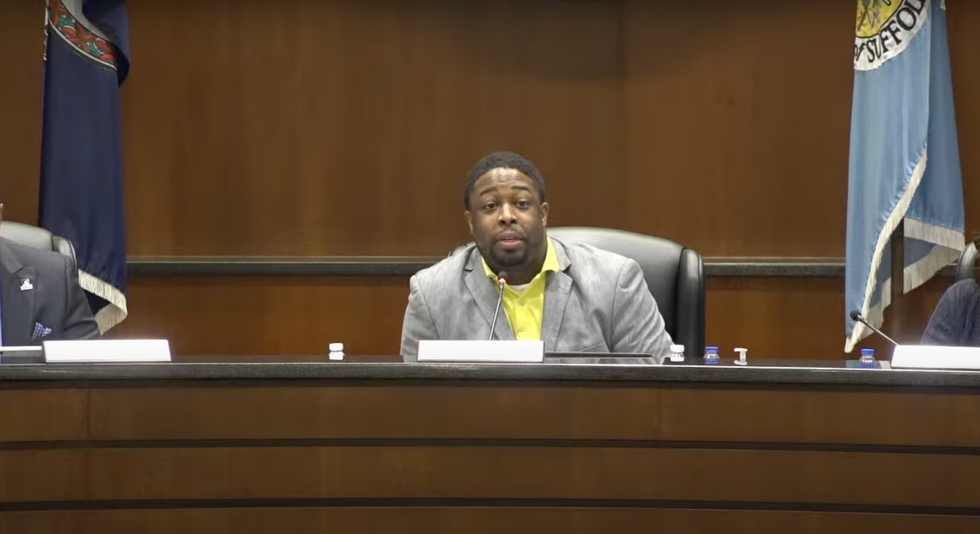As she asked those in the room to bow their heads and offered apologies to "anybody [who] objects," Board Chair Tyron Riddick interjected, "Excuse me, we can't do that."
