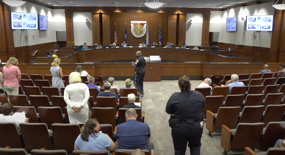 He then told police officers to “clear the room” during the recess, and a pair of officers were seen approaching the front of the public area of the meeting room: