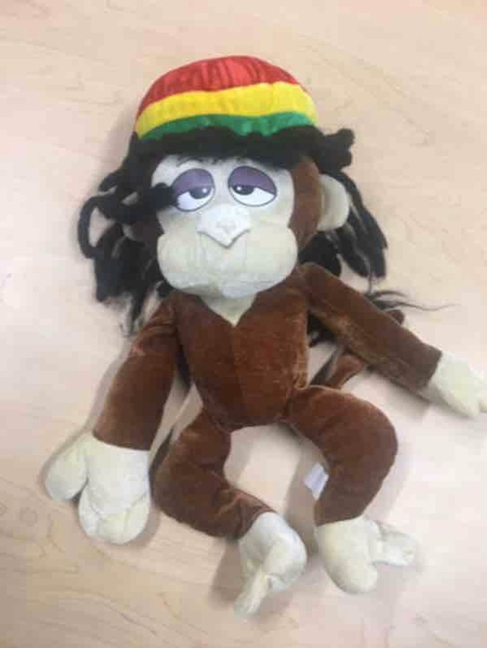 The stuffed monkey appeared to be sporting dreadlocks and a hat, both of which appear to be reminiscent of Rastafarian culture.