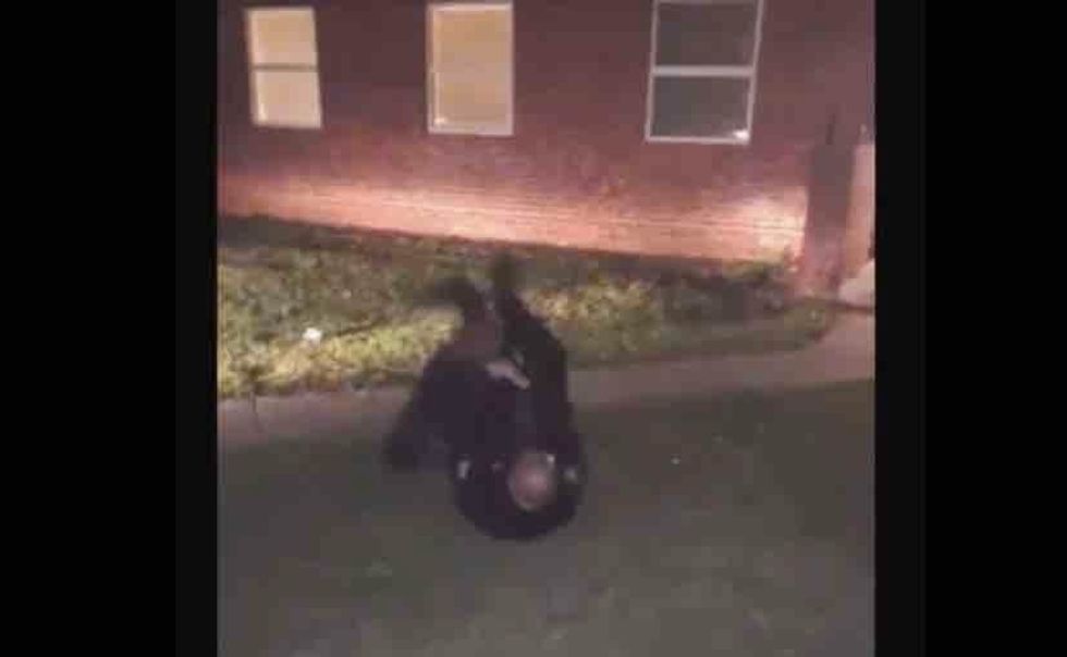 After the man lets go, the beating continues. "Don't you let that man take you to f***in' jail!" the same man is heard saying to the attacker.
