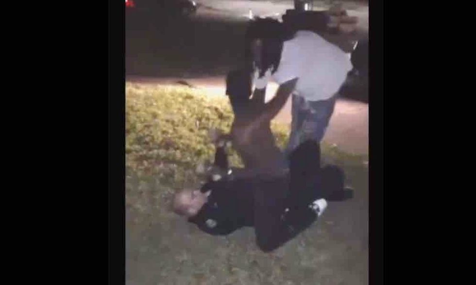 The clip does show one man pulling the attacker away from the officer, but another man is heard saying, "Let 'em whup his ass! Let 'em whup his ass!"