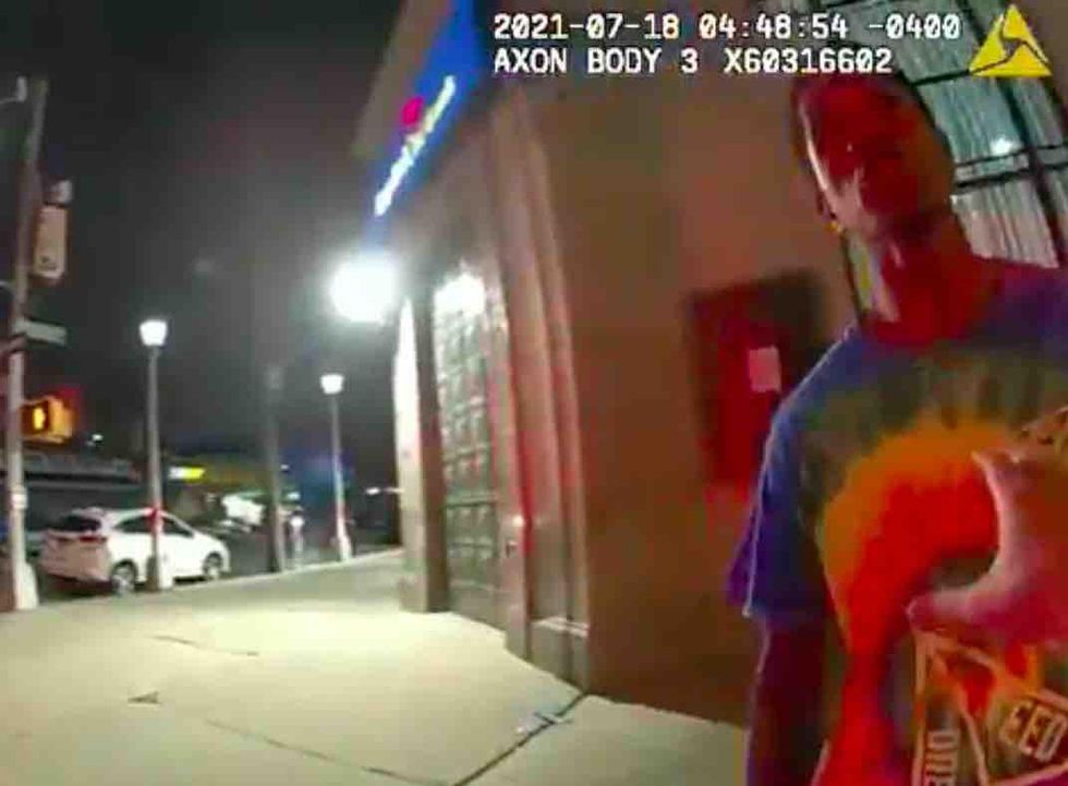 Bodycam video — which includes no audio — shows the suspect walking toward the officer and speaking. At one point the officer raises his right hand in an apparent attempt to prevent the suspect from getting any closer to him.