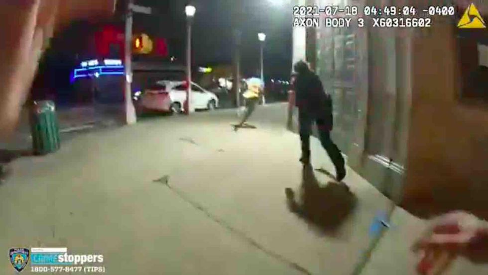 A violent repeat offender was caught on bodycam video smashing a glass bottle over a New York City police officer's head in an unprovoked attack on a Brooklyn street early Sunday morning.