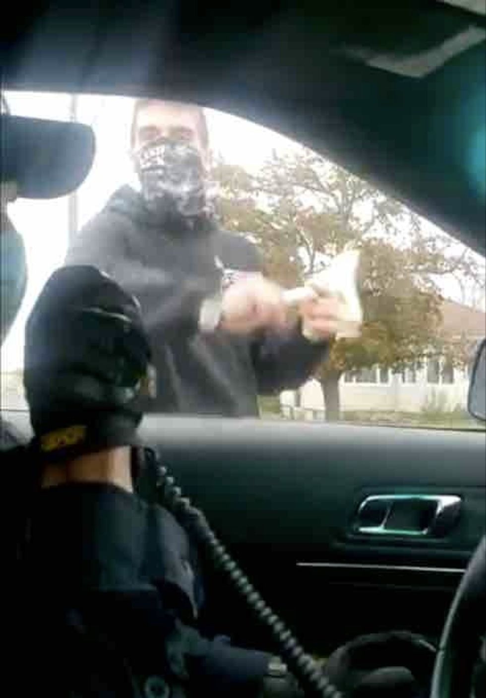 The officer behind the steering wheel calmly radios that "the male with camo is throwing rocks at us" as a second male dressed in dark clothing walks to the driver-side door, tells the cops to leave, and repeatedly pounds the driver-side window with the butt of a lacrosse stick and uses it to hit the hood.