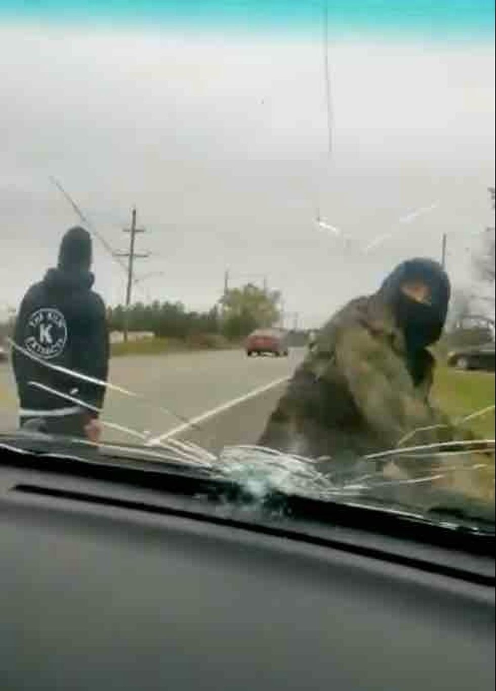 The male in camo also punches the passenger-side window before the first male resumes pounding on the hood — as well as the passenger-side window — with his lacrosse stick.