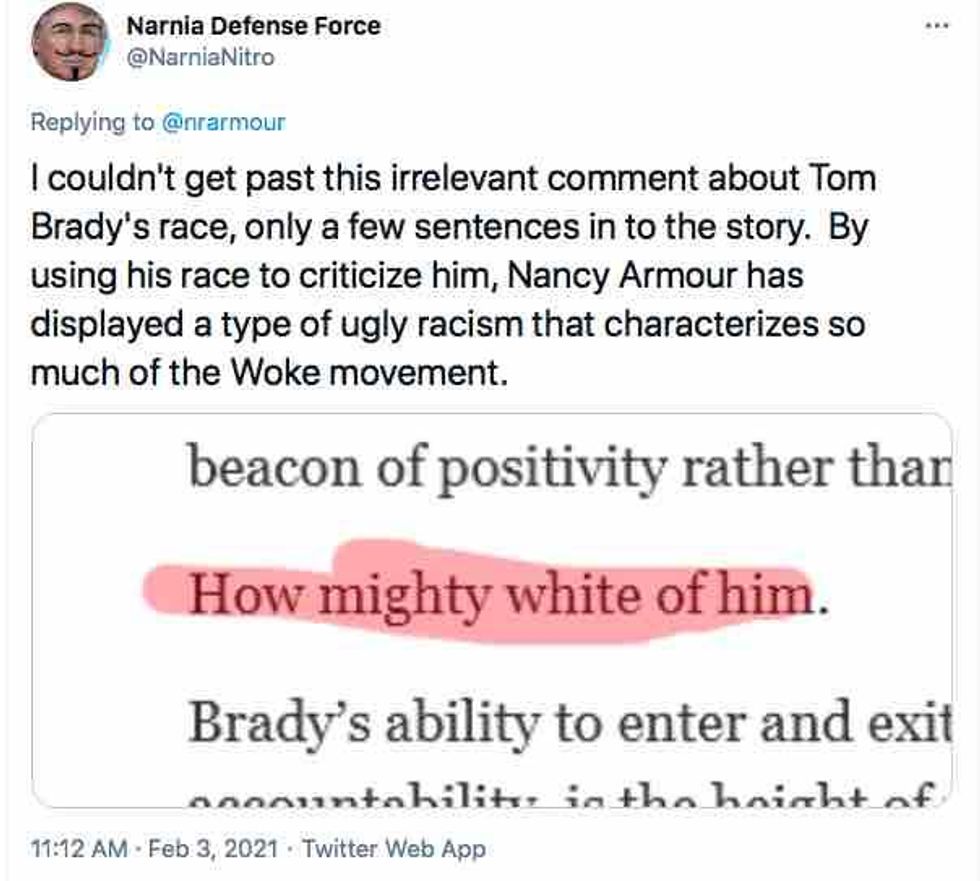 But anyway, Armour went on to say that "even Brady's aversion to talking about politics or current events is itself a form of privilege" and accused him of "moral cowardice."