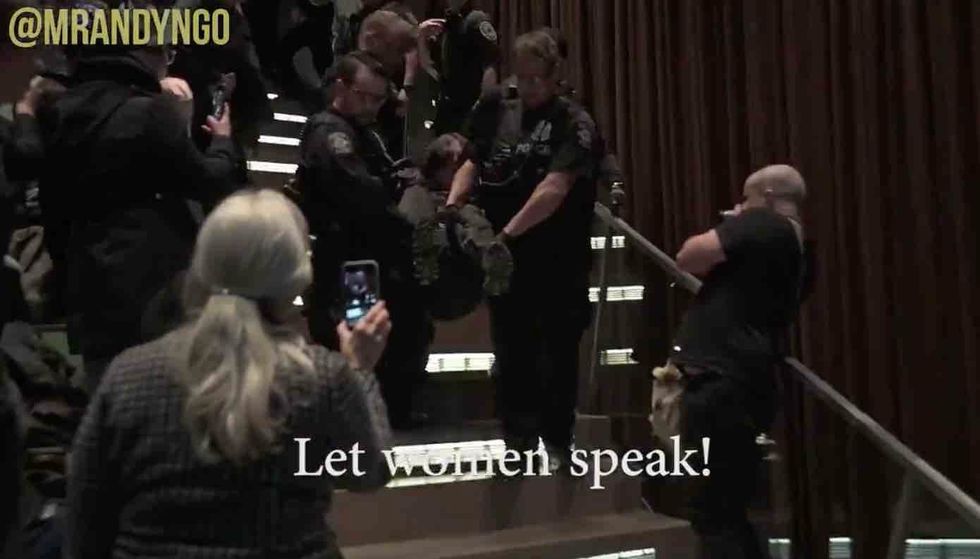 Police told the paper when the two attendees causing the disturbance refused to leave, officers arrested them and booked them for trespassing — with at least one getting carried out: