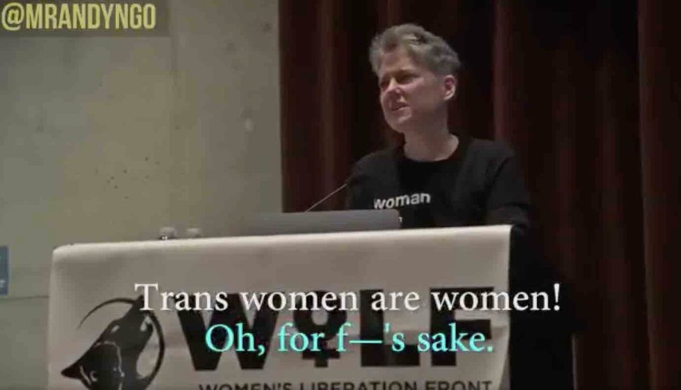 It all started with someone playing what sounded like a flute — and quite badly. Then a man in the crowd cried out, "Trans women are women!" And video caught the speaker's annoyed-yet-hilarious reaction: