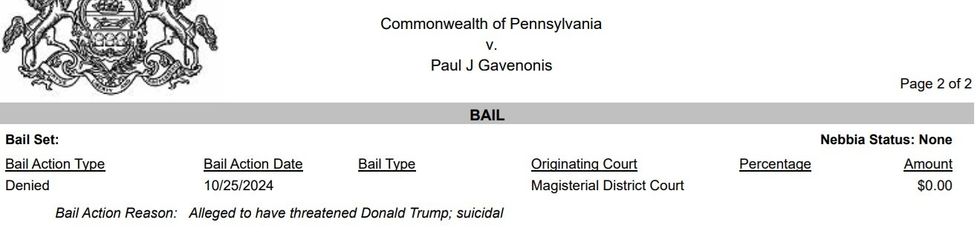 He was also denied bail in part because he was deemed "suicidal," the docket noted.