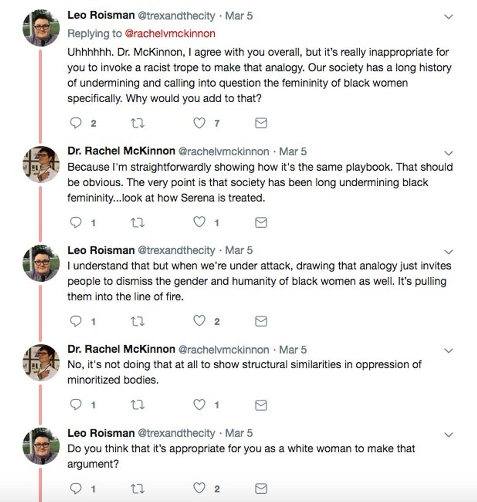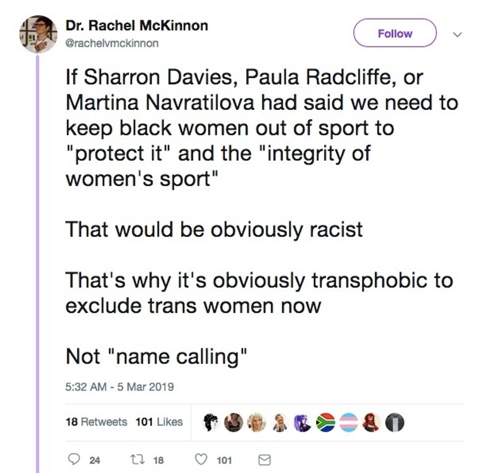 On the heels of ripping Davies and Navratilova, McKinnon — who's also a philosophy professor at the College of Charleston in South Carolina — added a doozy: Excluding transgender women from women's sports is akin to excluding black women from women's sports.