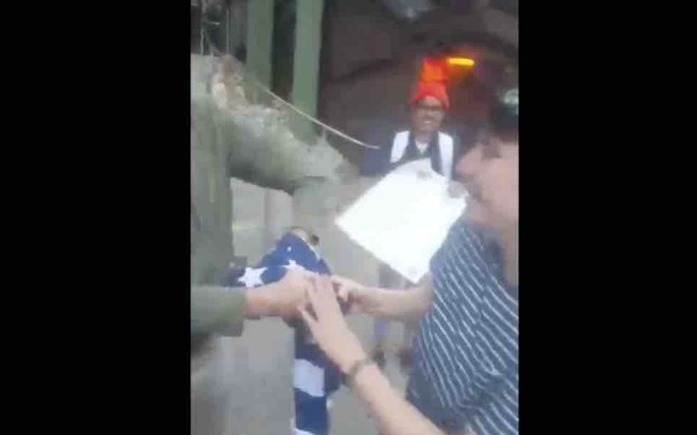 They yelled several times that the "Trump 2020" banner was a "flag of white supremacy." They ripped up and ripped down their signs. They spit on and tried to take away their Betsy Ross flag.