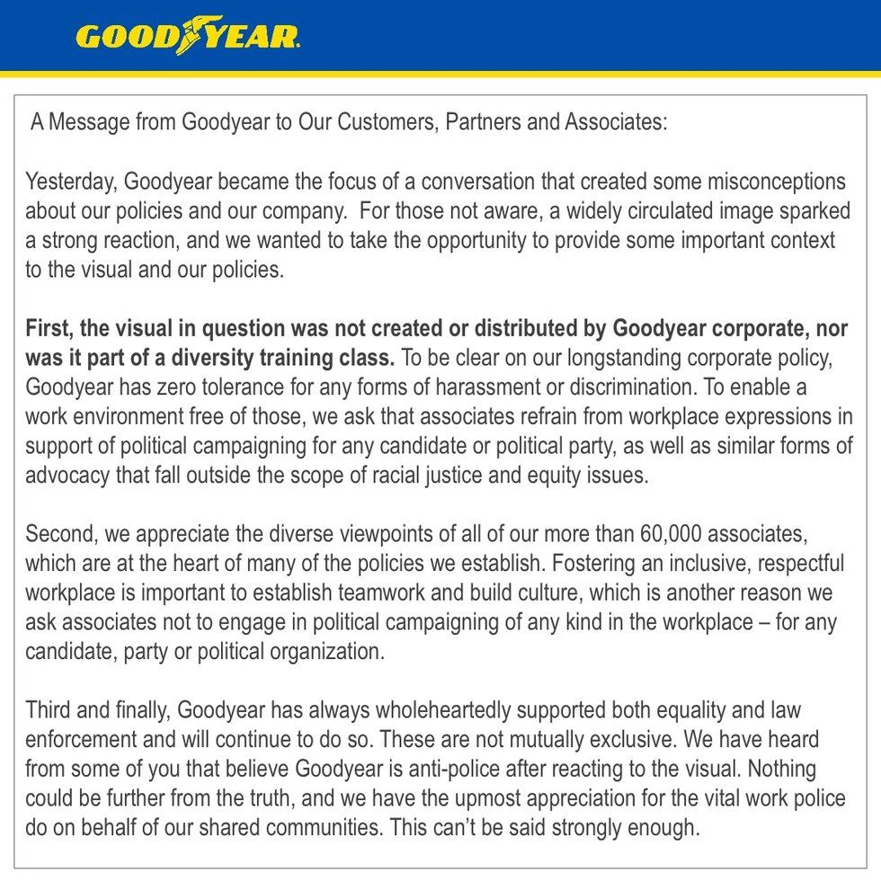 A spokesperson for Goodyear told TheBlaze, "Goodyear is committed to fostering an inclusive and respectful workplace where all of our associates can do their best in a spirit of teamwork. As part of this commitment, we do allow our associates to express their support on racial injustice and other equity issues but ask that they refrain from workplace expressions, verbal or otherwise, in support of political campaigning for any candidate or political party as well as other similar forms of advocacy that fall outside the scope of equity issues."