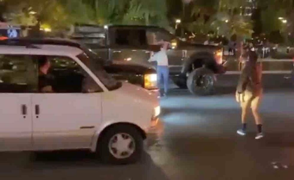 Among the clips of the rally posted to Twitter by Kitty Shackleford is one that seems to show the same Trump-hater going after another truck farther up the street.