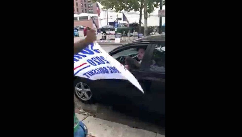 A short clip circulating on social media shows one of the Trump supporters standing on a sidewalk holding a pro-Trump banner in front of the driver's open window. They exchange words — some of them of the four-letter variety — and the phrase "you lost" is stated.