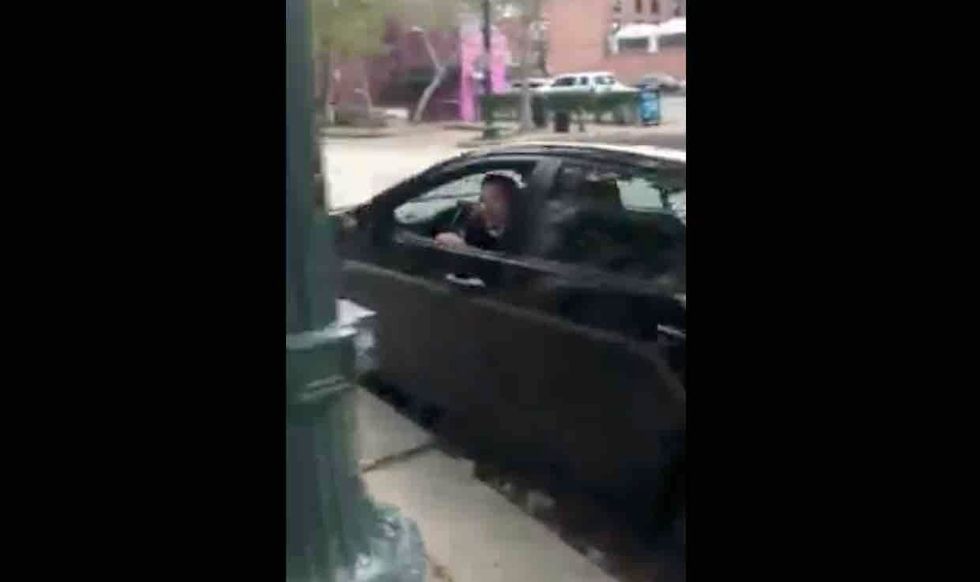 Then as the driver speeds away, he makes the mistake of turning his head back toward the Trump supporter in order to deliver one, final parting shot: "Stupid a**hole!" he apparently yells.