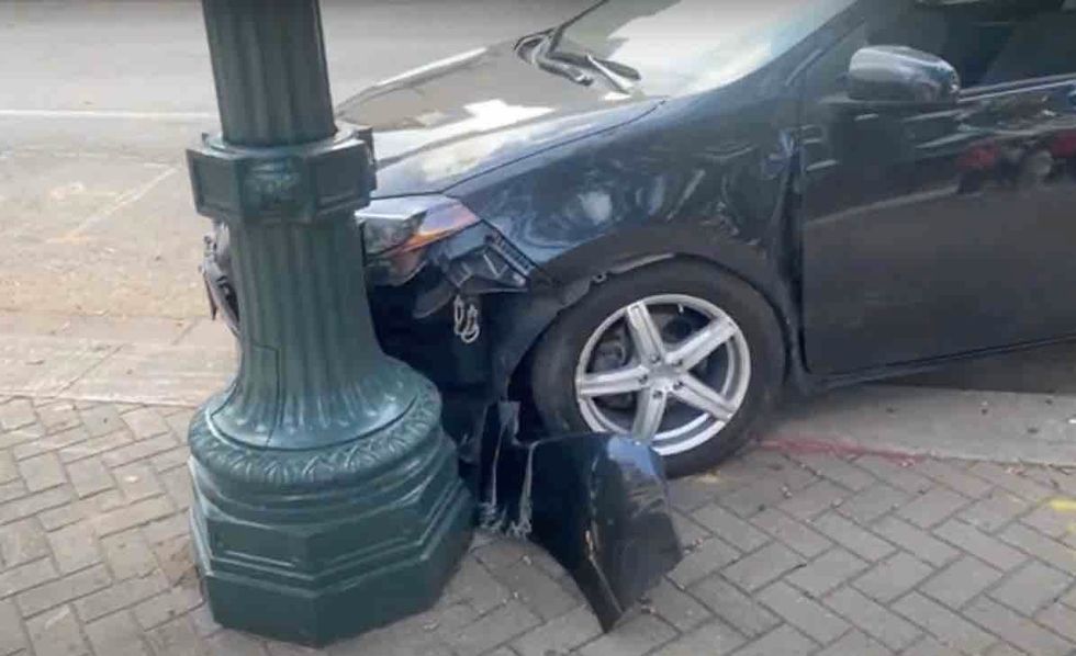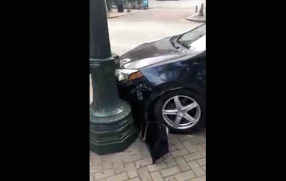 He promptly crashes his car into a light pole — to the delight of nearby Trump fans.