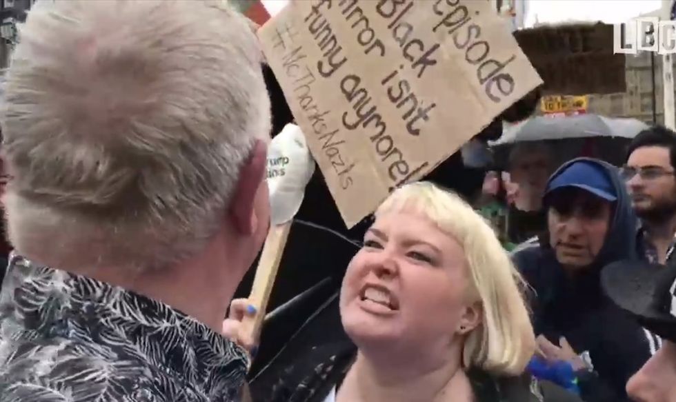 Video recorded by a reporter from Leading Britain's Conversation showed the man at first arguing with protesters while wearing a red "Make America Great Again" hat — the symbol of Trump's 2016 campaign that's become a lightning rod for a growing number of those on the left who say the MAGA hat is synonymous with racism, bigotry, and hatred.