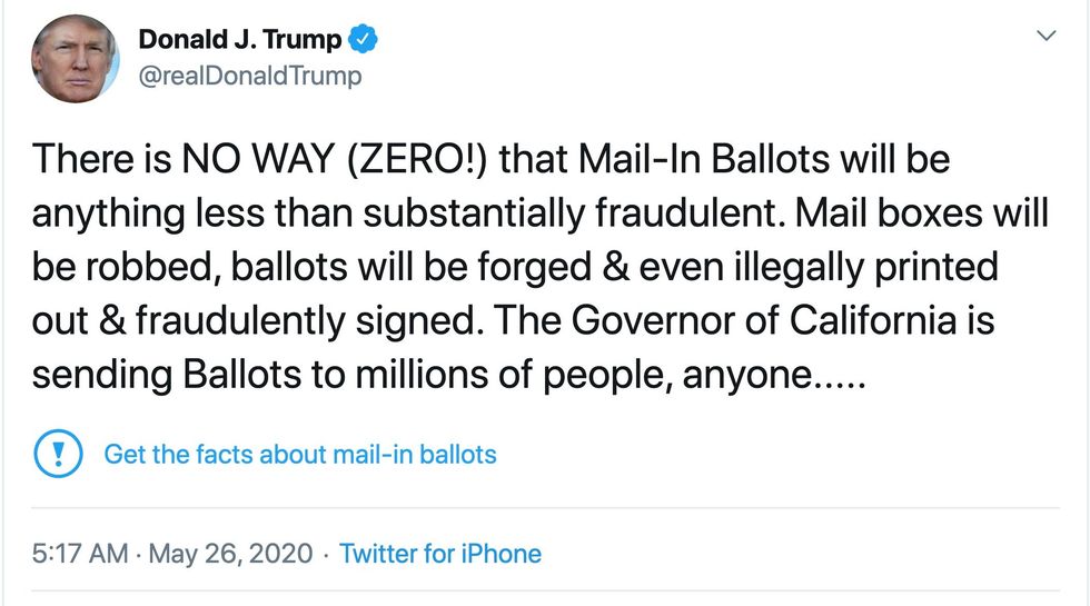 When viewed on Twitter, the tweet now displays a message that reads "Get the facts about mail-in ballots" and links to tweets countering what the president said about the issue.