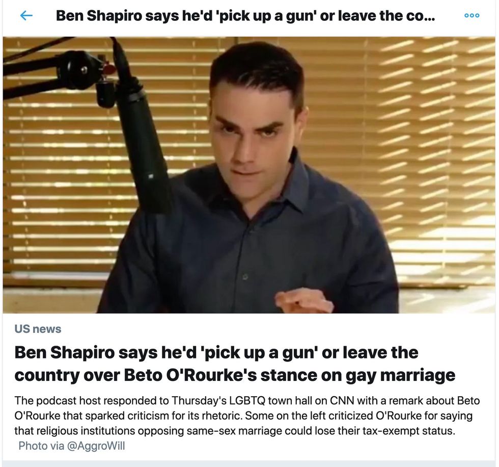 The report was posted to the social media platform under the headline, "Ben Shapiro says he'd 'pick up a gun' or leave the country over Beto O'Rourke's stance on gay marriage."
