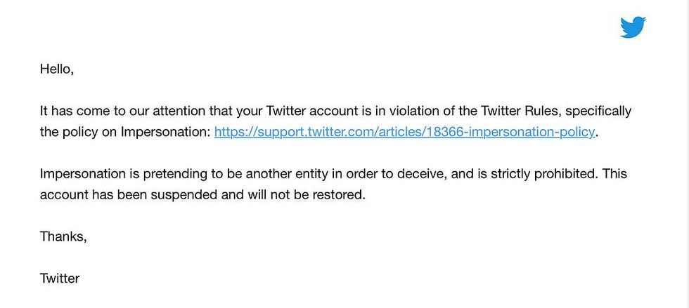 "It has come to our attention that your Twitter account is in violation of the Twitter Rules, specifically the policy on impersonation," Twitter wrote to Yenisey. "Impersonation is pretending to be another entity in order to deceive, and is strictly prohibited."