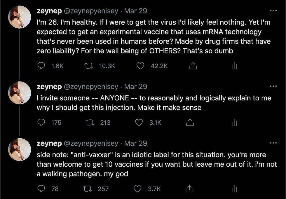 Yenisey's March 29 tweet, which was retweeted over 10,000 times, raised concerns about being asked to take an "experimental vaccine" when she is young, healthy, and at relatively low-risk of contracting a life-threatening case of COVID-19.
