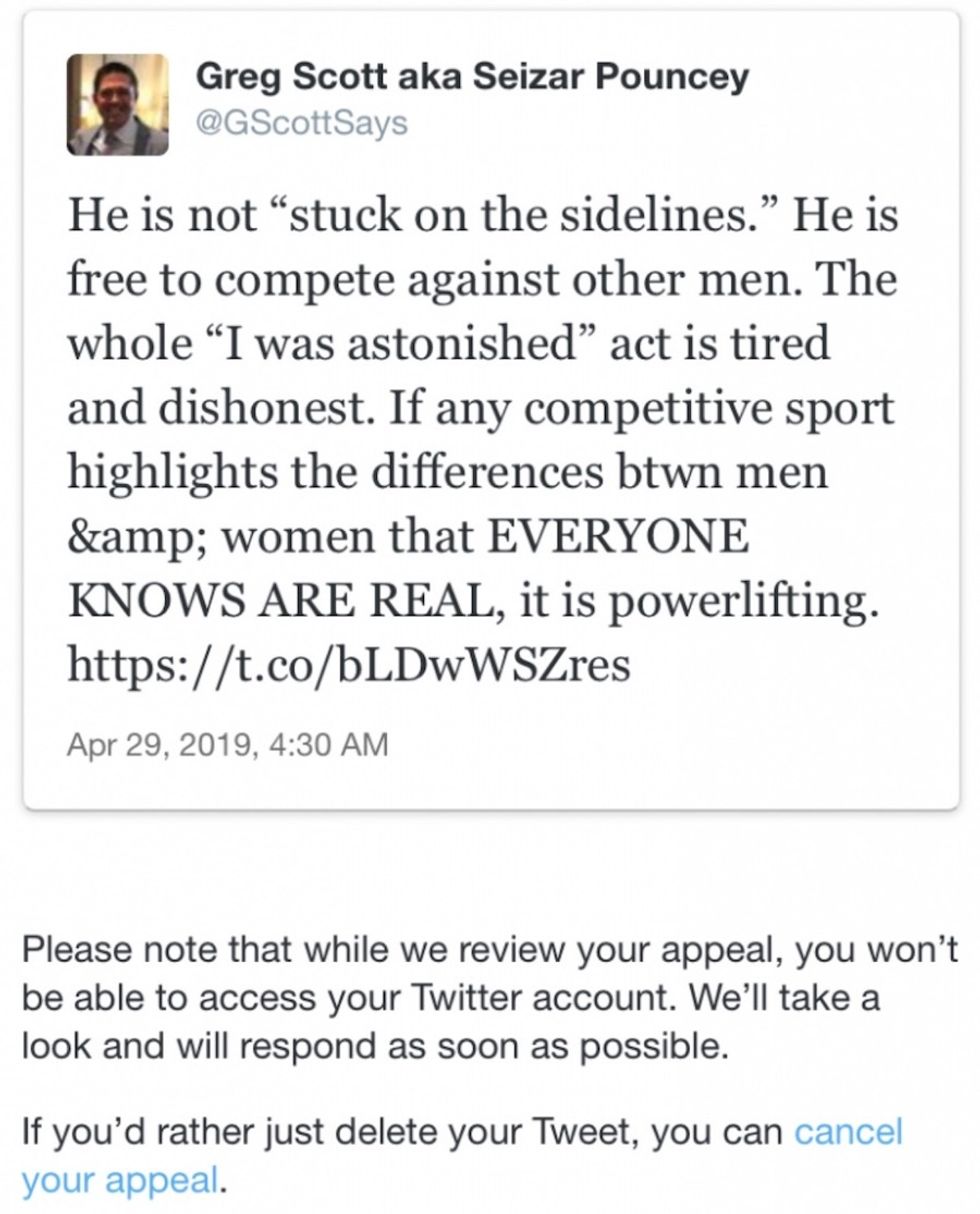 "If a relatively benign and common sense point – that women shouldn't be forced to compete against male powerlifters – can now get someone banned from the platform, Twitter is signaling an increasingly aggressive ideological enforcement regime," Scott said to PJ Media.