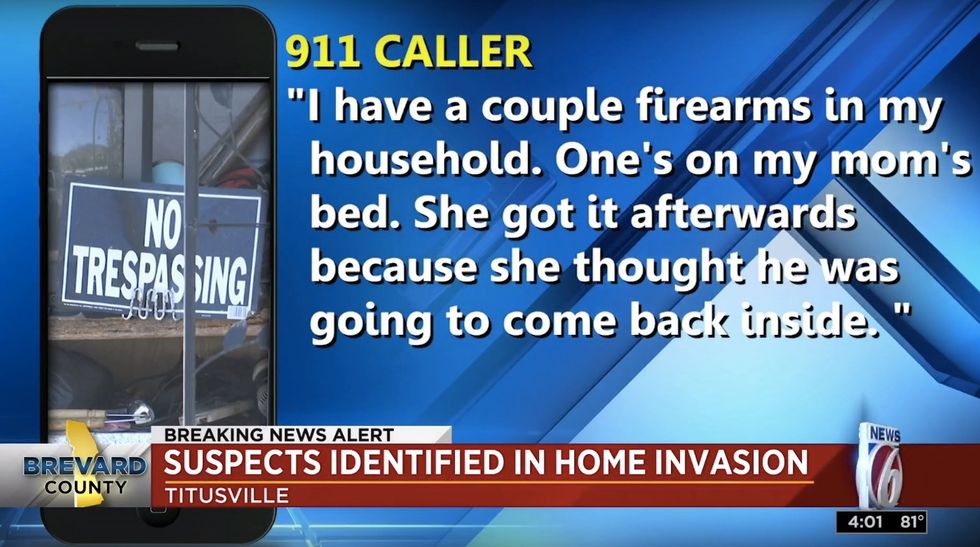 The man also can be heard on a 911 call — distraught and breathing heavily — saying one of the intruders "held my mom at gunpoint." He added to the dispatcher that "me and my mom are fine, thank God" and that "the person that had the vehicle is dead in my bed."