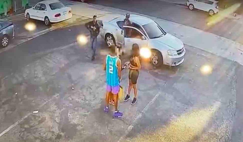 Surveillance video obtained by Los Angeles police detectives showed a silver Dodge Avenger back up toward the group standing in the lot near Melrose Avenue and Vista Street around 7:10 p.m. after which two men emerged from the vehicle, police said.