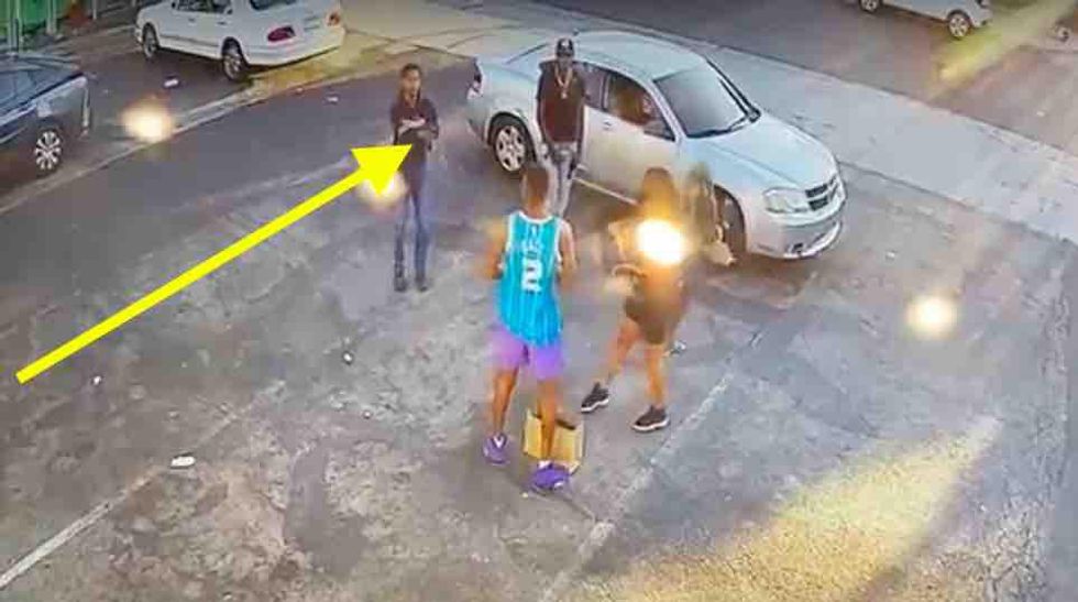 But the man in the group — dressed in a blue tank top and who had been holding a beige shopping bag — wasn't about to let the stickup continue. Police said he pulled a gun of his own and fired it at the two assailants "apparently to defend himself and others in his group from the would-be robbery suspects."