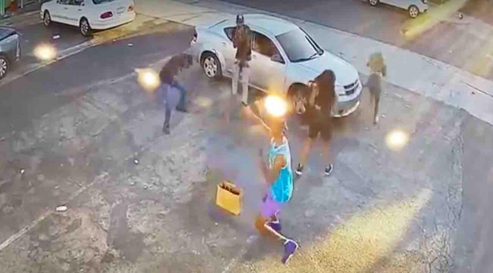 After the man in the blue tank top fired his gun, video shows everybody in the parking lot fleeing on foot, and the individual behind the wheel of the vehicle drove it away as well.