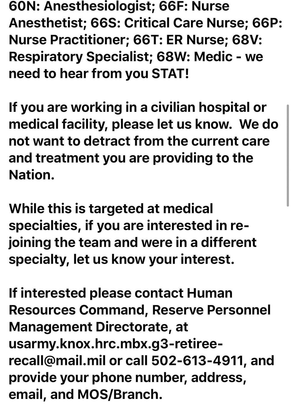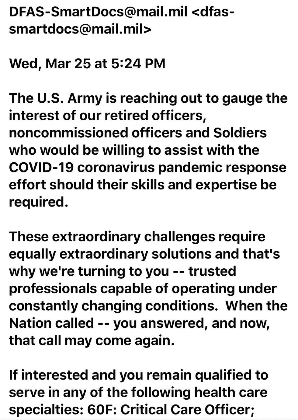 The message, which was obtained by TheBlaze on Thursday, detailed the specialties needed by the U.S. military in order to help fight COVID-19.