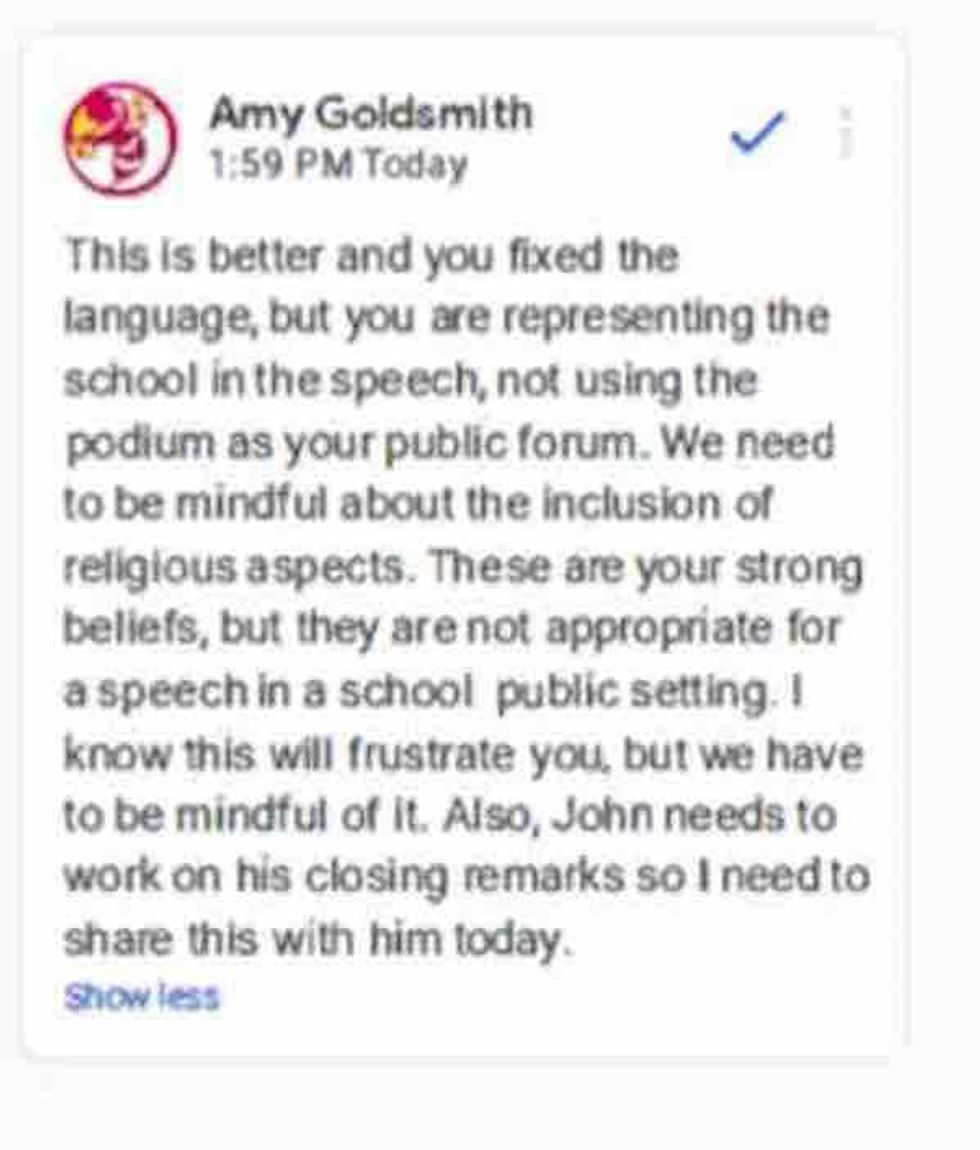 The legal firm said the school's principal, Amy Goldsmith, reacted by highlighting that paragraph, along with a second, and telling Turner that "you are representing the school in the speech, not using the podium as your public forum. We need to be mindful about the inclusion of religious aspects. These are your strong beliefs, but they are not appropriate for a speech in a school public setting. I know this will frustrate you, but we have to be mindful of it."