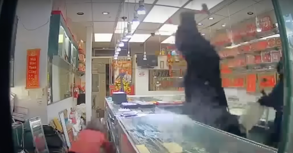 Surveillance video shows 69-year-old mother Diane ducking for cover and screaming for help as the robbers — wearing black masks and clothing and armed with guns and hammers — enter Phuong Jewelry around 12:30 p.m. Wednesday, KGO said.