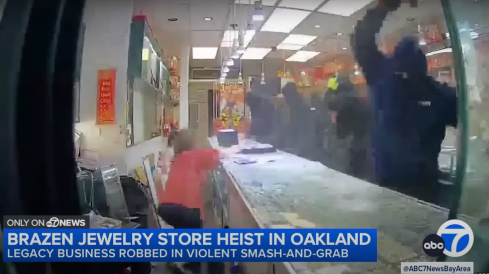 Eight armed individuals were caught on surveillance video smashing the display cases of an Oakland jewelry store this week and making off with almost all of the family-owned business' inventory in a brutal, devastating heist that took place in broad daylight.