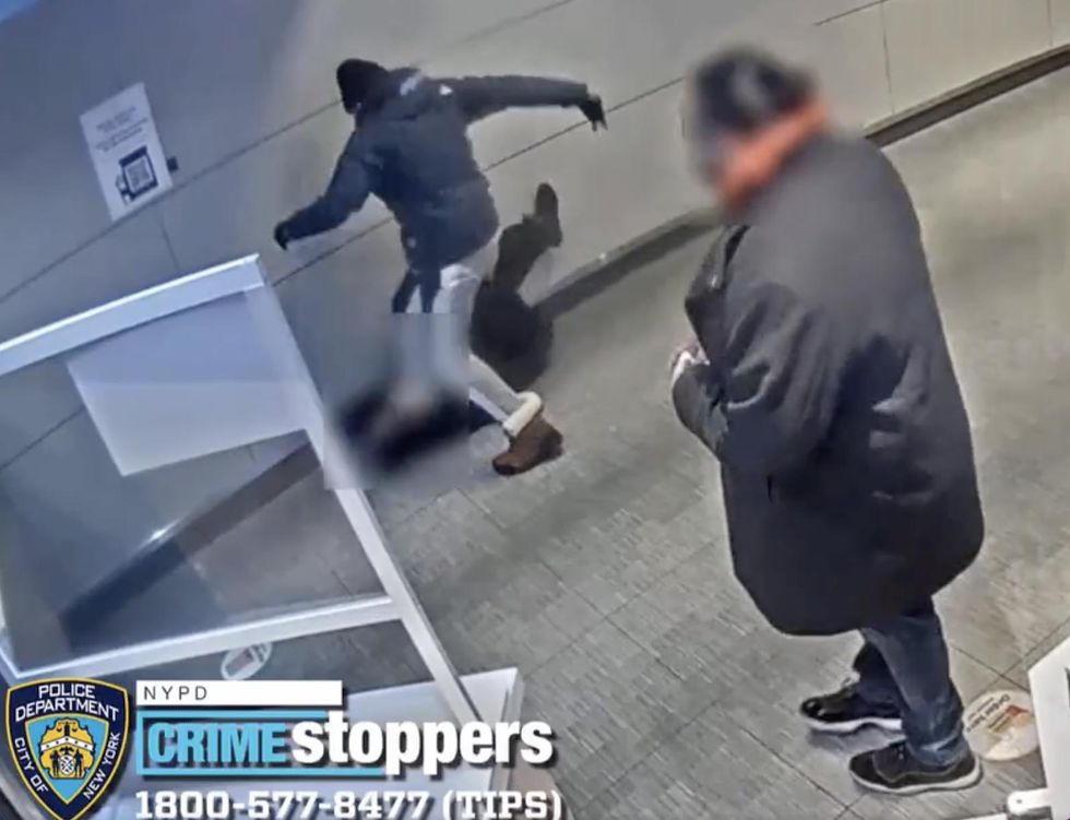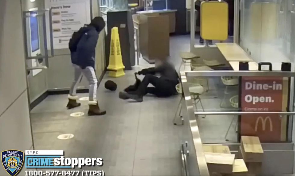 A fairly sizable bystander simply watched as surveillance video recorded a violent crook repeatedly punching, stomping, knocking down, and then stealing from a McDonald's customer in New York City.