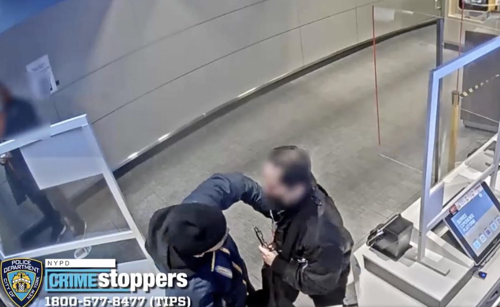 Surveillance video showed the attacker seated while the customer appeared to be making a transaction at the counter.