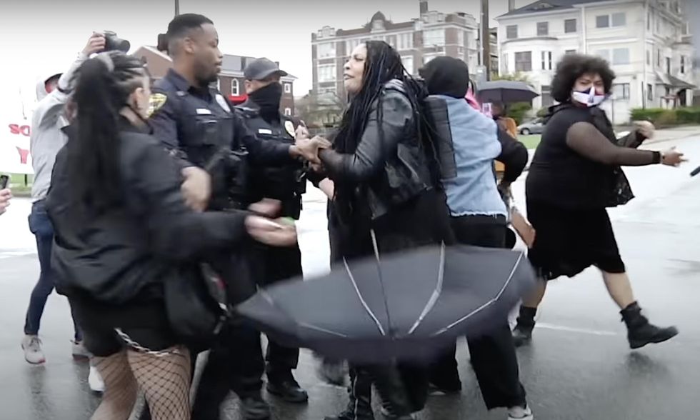 With that, a number of protesters converged upon a police vehicle and cursed out the officer, telling him "F*** you!" and "Let her speak!" and "We're not scared of you!"