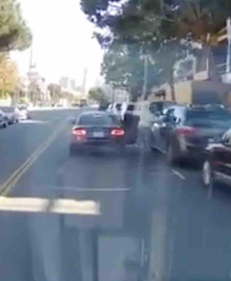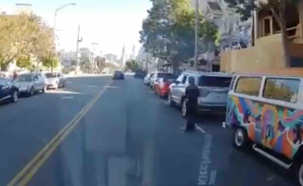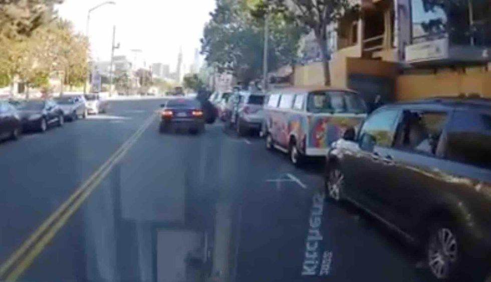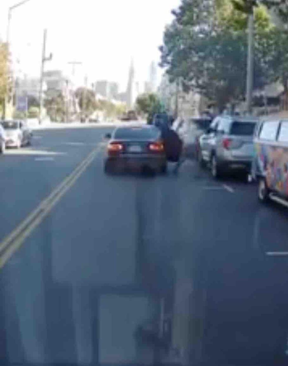The culprit follows alongside his getaway vehicle and skips a Volkswagon van painted in 1960s psychedelic fashion and parked in the opposite direction — hey, it's Frisco, after all — but he goes to work on the very next vehicle, presumably smashing a window and reaching in and grabbing property and tossing it in the getaway vehicle.