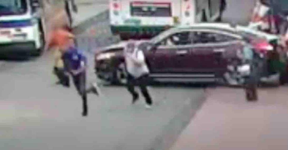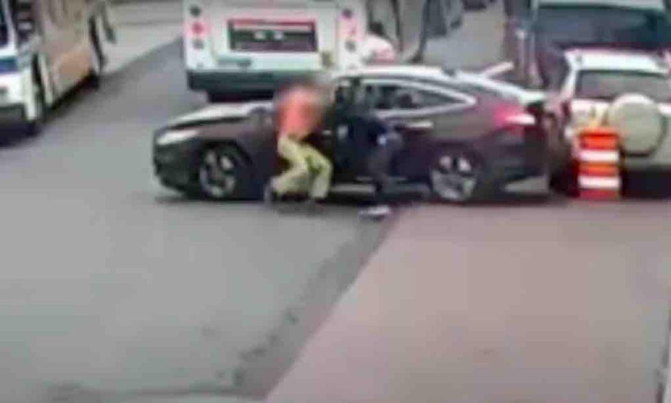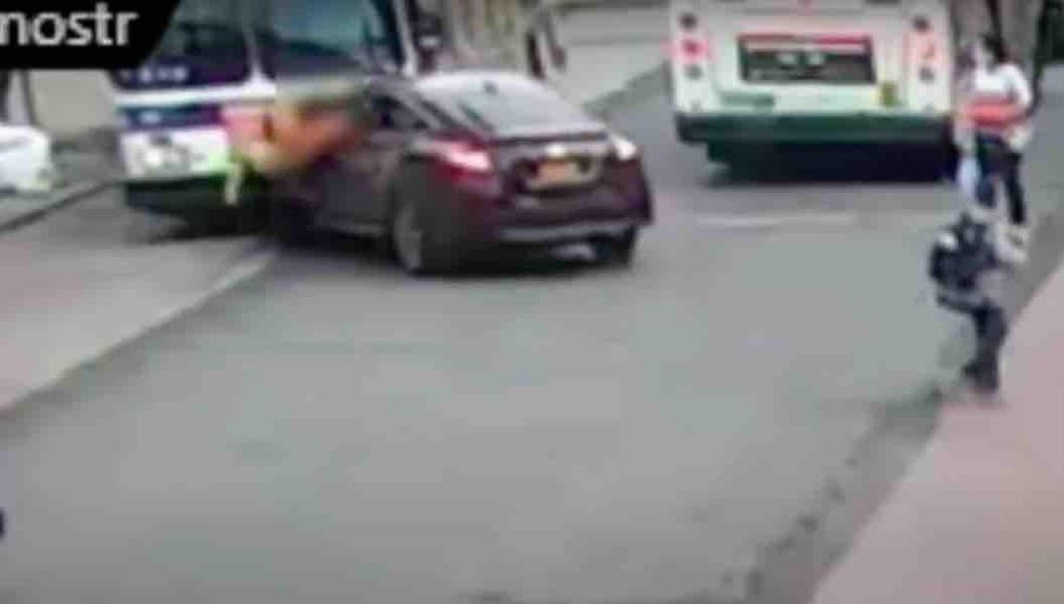 Video shows the car accelerating across the street — and as the car owner's legs dangle above the road, the crook crashes the car into a parked bus, and the car owner's legs fly upward due to force of the impact.