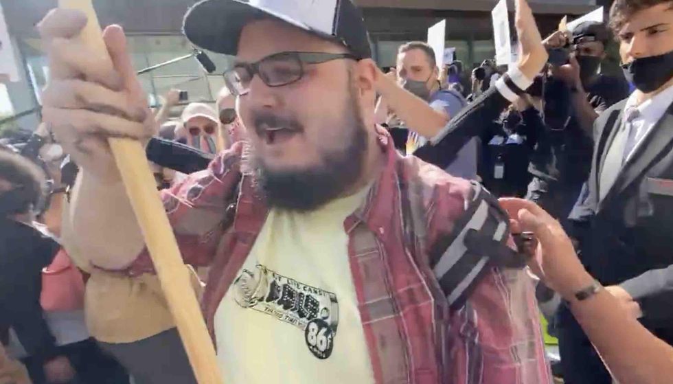 "He's got a weapon!" the man who destroyed his sign yelled, after which comrades dutifully repeated the claim. The smiling victim played along, too.