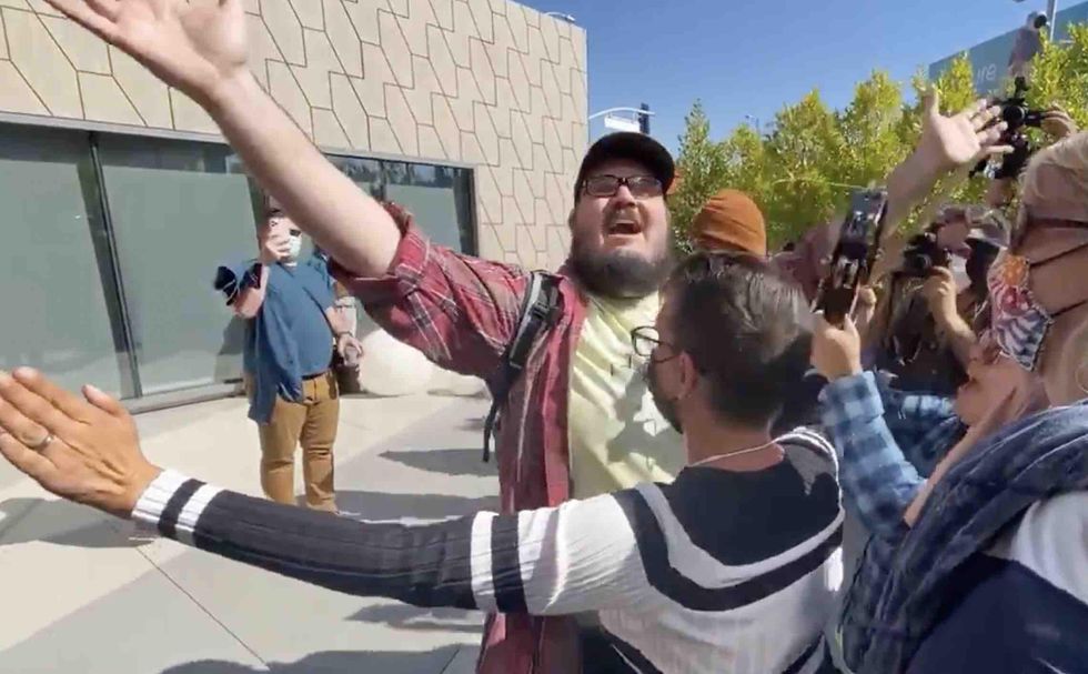 Then the Chappelle supporter turned around and faced down the hungry mob — a shorter member of which stood inches from him with arms stretched wide for some reason.