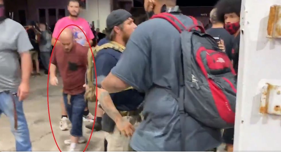 In the clip, one bald white, bearded individual who was seen wearing a maroon shirt, white sneakers, and carrying a white plastic bag begins to taunt one of the militia members (some of whom were black), saying, "shoot me, n*****!"