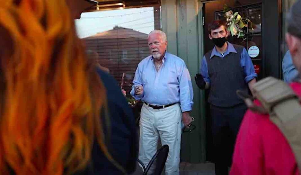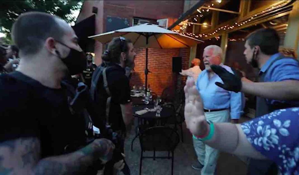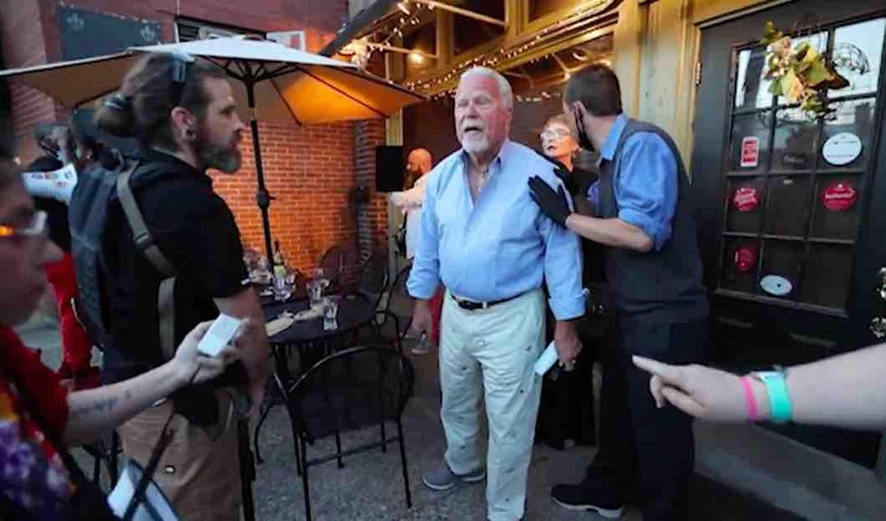Video of the confrontation begins with an image of the white-haired man in a blue dress shirt and light-colored pants standing near one of the outdoor tables and pointing a small handgun at the protesters, who are hollering and making gestures — but not daring to get anywhere near him.
